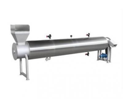 該機由機架、傳動電機、傳動罩殼、螺旋軸、進料斗、蒸汽加熱室、出料口等部件組成。工作時:無級調(diào)速電機經(jīng)過鏈條驅(qū)動螺旋軸旋轉(zhuǎn),蒸汽進入蒸汽加熱室后通過殼體表面?zhèn)鳠幔訜釟んw內(nèi)物料。物料從進料斗進入殼體后,轉(zhuǎn)動的輸送螺旋邊推進邊預(yù)煮, 后由料翻板將物料從出料口送出。該機無級調(diào)速,可連續(xù)作業(yè),適用多種果蔬及肉類加工。