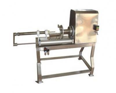 該設備適用于菠蘿的去皮,通過本機可以完成去皮,捅心兩道工序,以得到圓柱形菠蘿果筒。菠蘿用人工切去頭尾兩端后,由人工擺放在放料架上,放料架可調節中心高度;由氣缸將菠蘿向前推送,經過特制劃皮刀將菠蘿外皮劃破,推入高速旋轉著的去皮刀筒,將菠