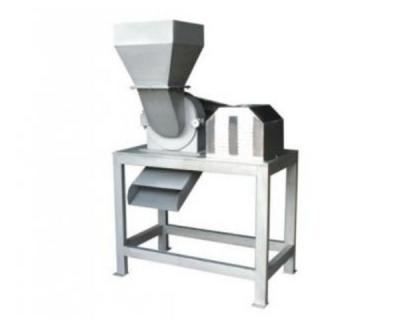 該機由機架、傳動罩、軸承座、機身、進料斗、定子、轉子、刀片、大側蓋、出料斗、鉸鏈、電機罩等部件組成。適用于蘋果、梨、西紅柿、根類等果蔬破碎(核果類除外)。工作時電機帶動主軸旋轉。由前道工序升運上來的物料落入進料斗中,物料進入機身后由于轉子上的筋板帶動物料高速旋轉,定子上的刀排將物料進行破碎(刀排可兩面使用),此時物料一般粒度在4-8mm左右(可根據刀排的齒距、定子的槽寬及轉速而定),破碎后的物料從定子上的腰形孔中落入至出料口。