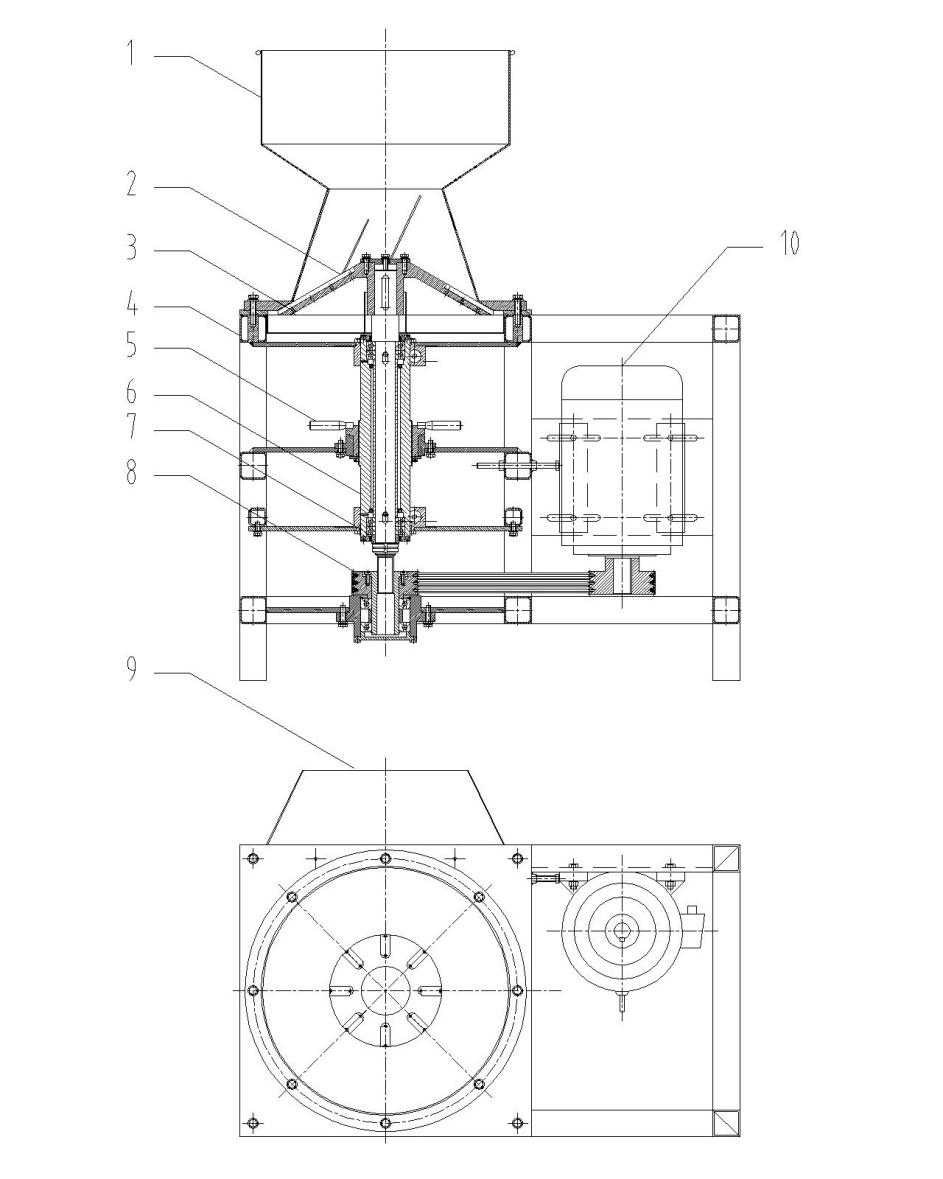 1、進(jìn)料斗;2、齒刀片;3、刀盤(pán);4、機(jī)架;5、轉(zhuǎn)子升降機(jī)構(gòu);6、軸承架;7、軸承;8、皮帶傳動(dòng)機(jī)構(gòu);9、出料斗;10、電機(jī)